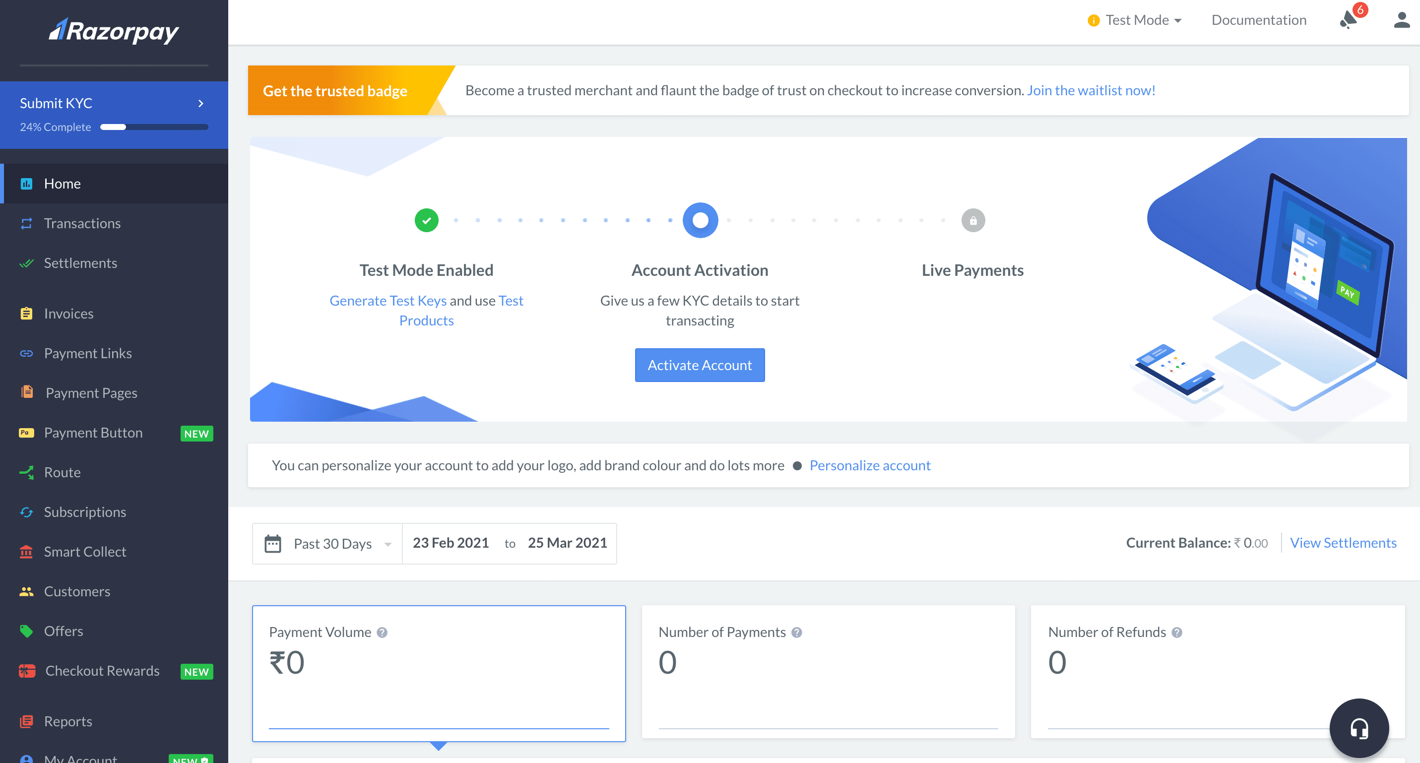 - Head over to Razorpay Dashboard to get your test mode API keys. 3